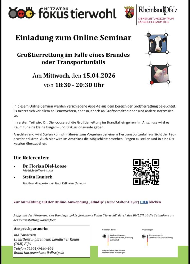 Der Ersatztermin für das im letzten Jahr abgesagte Online-Seminar Großtierrettung steht fest: 15.04.2026 – 18:30 Uhr.